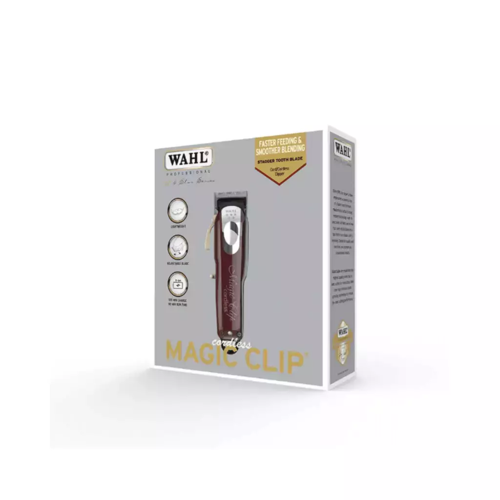 A Magic Clip 5 Star é destinada apenas para uso profissional e é projetado para oferecer o desempenho nítido que os especialistas exigem com a liberdade de um cortador sem fio. A Magic Clip é o melhor cortador sem fio. Possui lâminas de sobreposição zero de alta precisão, que oferecem velocidade e facilidade de uso, uma alavanca cônica conveniente para facilitar do zero baixo para o zero alto. Uma bateria de íon de lítio com autonomia de mais de 90 minutos por carga. Para sua conveniência, a Magic Clip sem fio 5 star vem com todos os acessórios necessários para uso profissional.